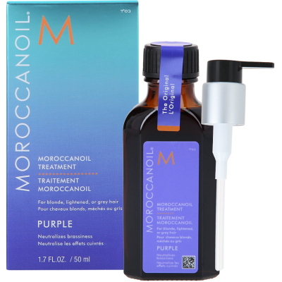Moroccanoil Treatment Purple - Filetowa kuracja do włosów blond, rozjaśnionych i siwych 50 ml jest to bardzo dobrze znana kuracja, która została wzbogacona o tonujące fioletowe pigmenty. Pożegnaj się z ciepłymi tonami. Opracowana specjalnie dla włosów blond, rozjaśnianych oraz siwych, aby zneutralizować ciepłe tony i redukować niepożądane żółte i pomarańczowe odcienie. Ta bogata, ale lekka formuła z olejkiem arganowym natychmiast wnika we włosy, aby zwiększyć ich podtatność na układanie, nadać im połysk i zapewnić długotrwałe odżywienie i miękkość, bez pozostałości produktu na włosach.