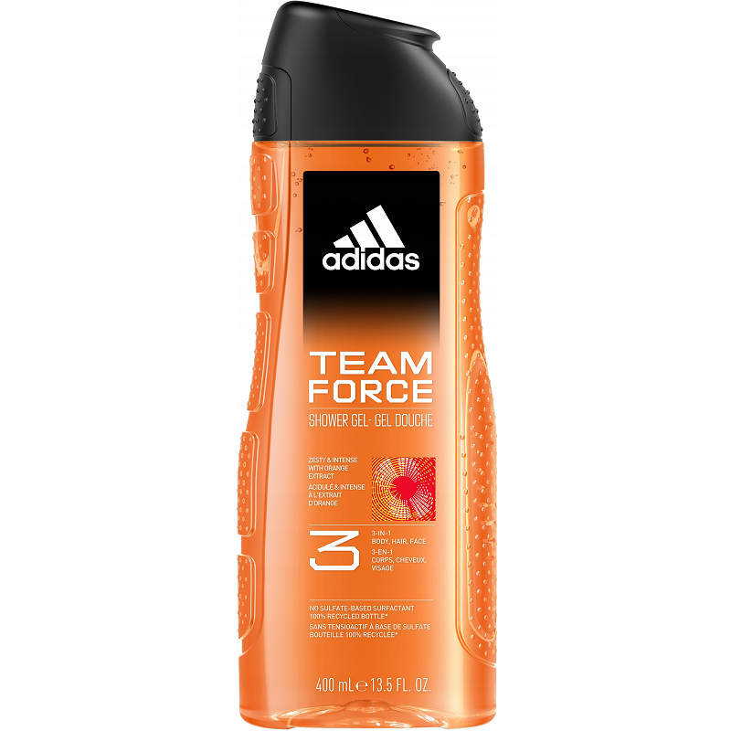Żel pod prysznic adidas Team Force zawierający naturalny olejek eteryczny z pomarańczy i paczuli