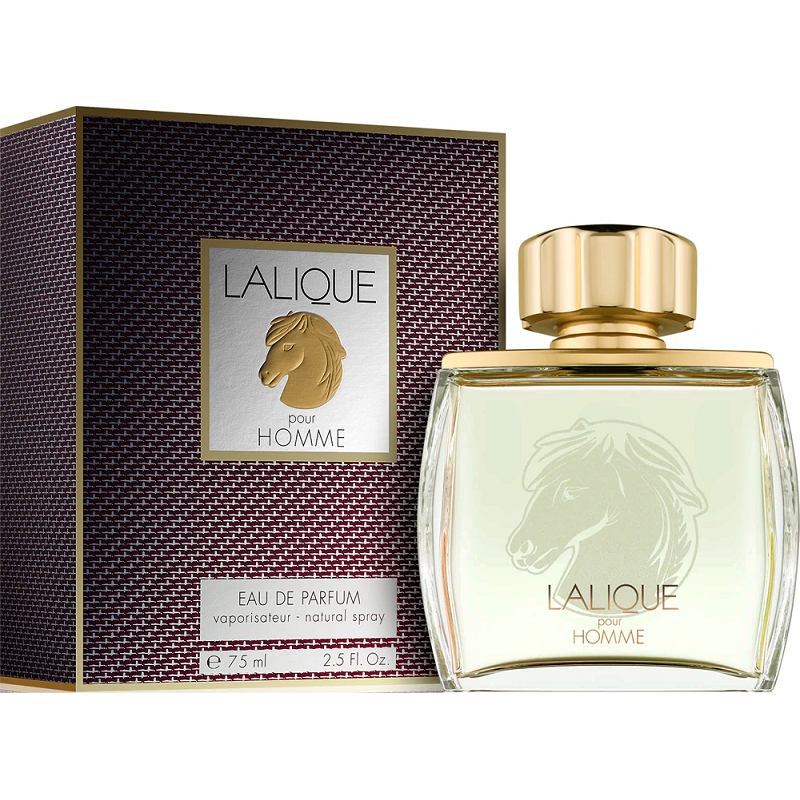 Flakon z charakterystycznego dla Lalique, szlachetnego w formie szkła, ozdabia dumny wizerunek rumaka.